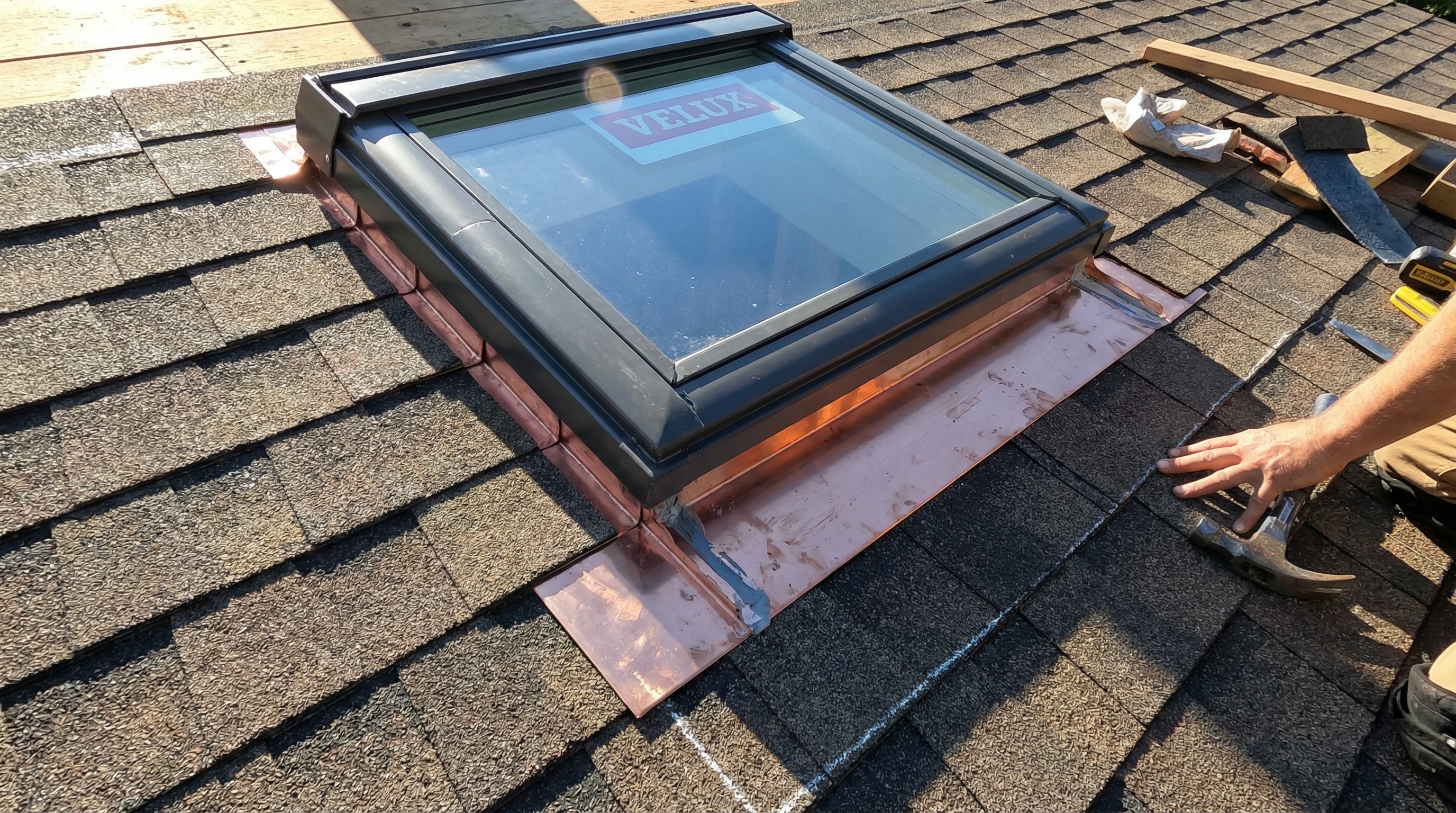 Finally, the skylight unit is placed onto the curb, secured, and sealed to be completely watertight. The surrounding roofing materials are reinstalled and integrated with the flashing for a seamless finish.