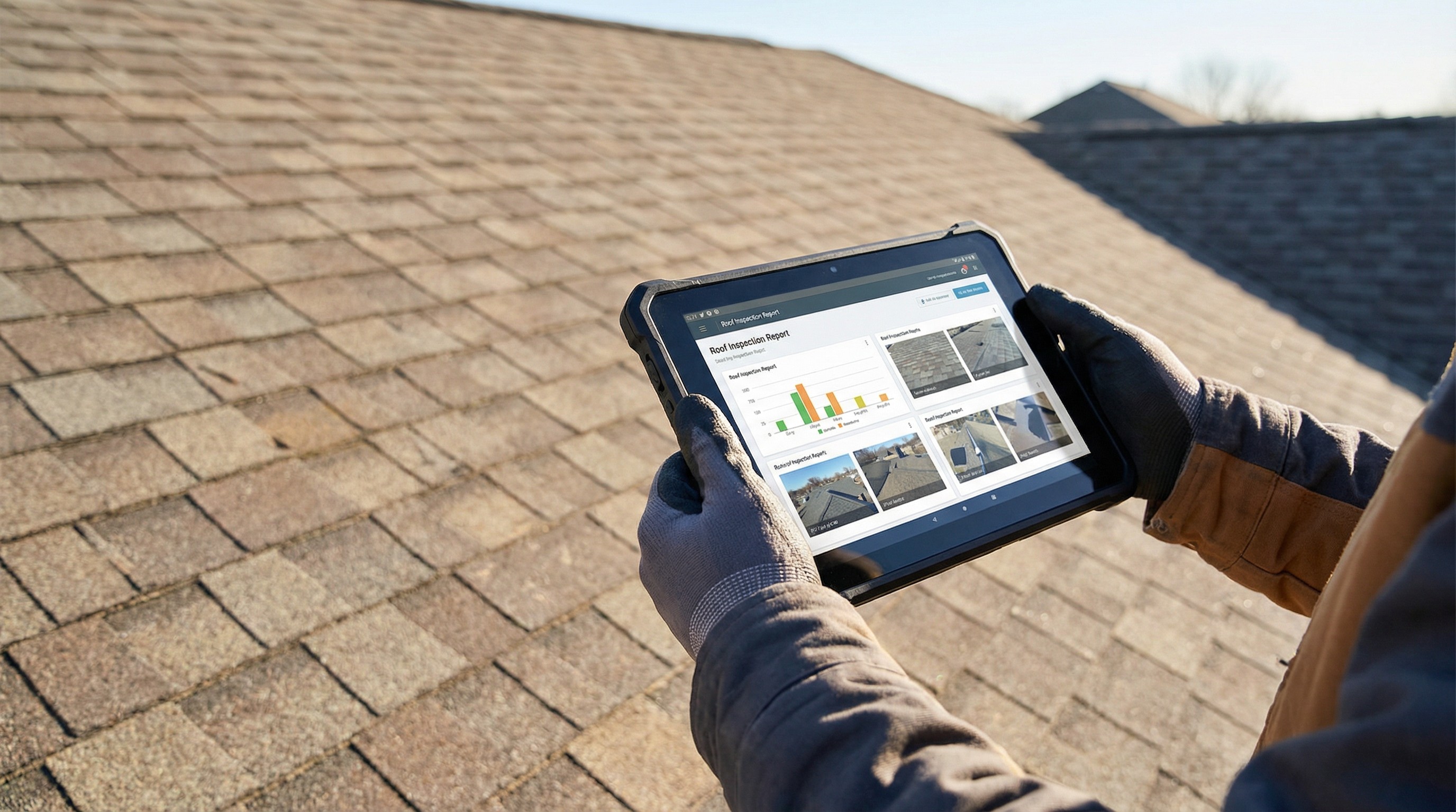 Exterior walkthrough: A technician examines shingles, flashing, gutters, and vents for visible wear or damage