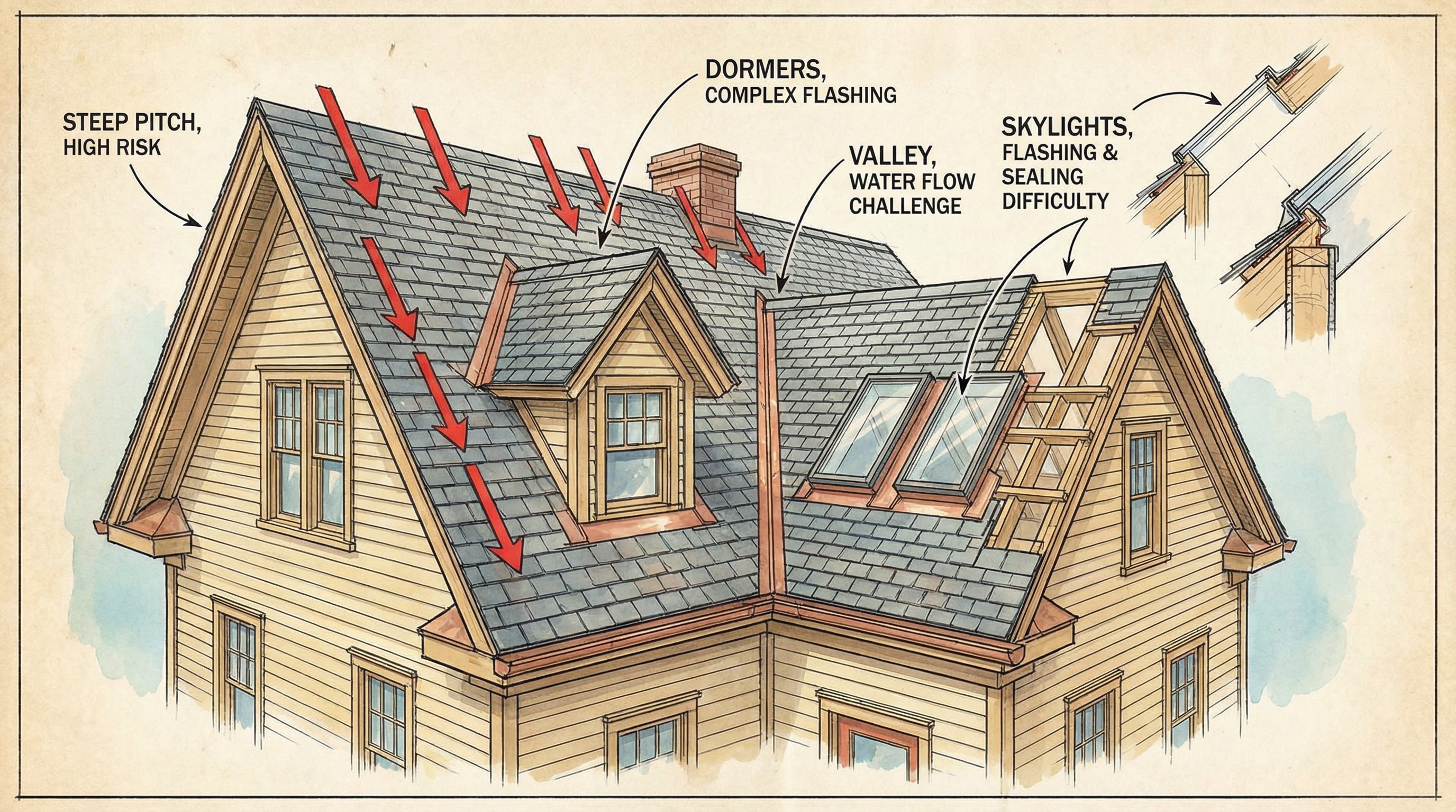 Every penetration in your roof requires custom flashing to prevent leaks. The more features your roof has, the more materials and labor hours go into the job.