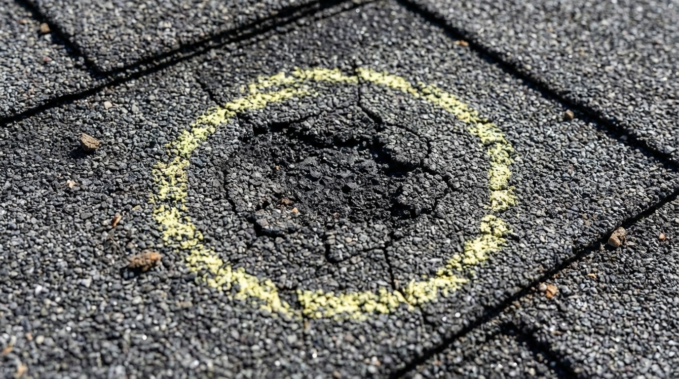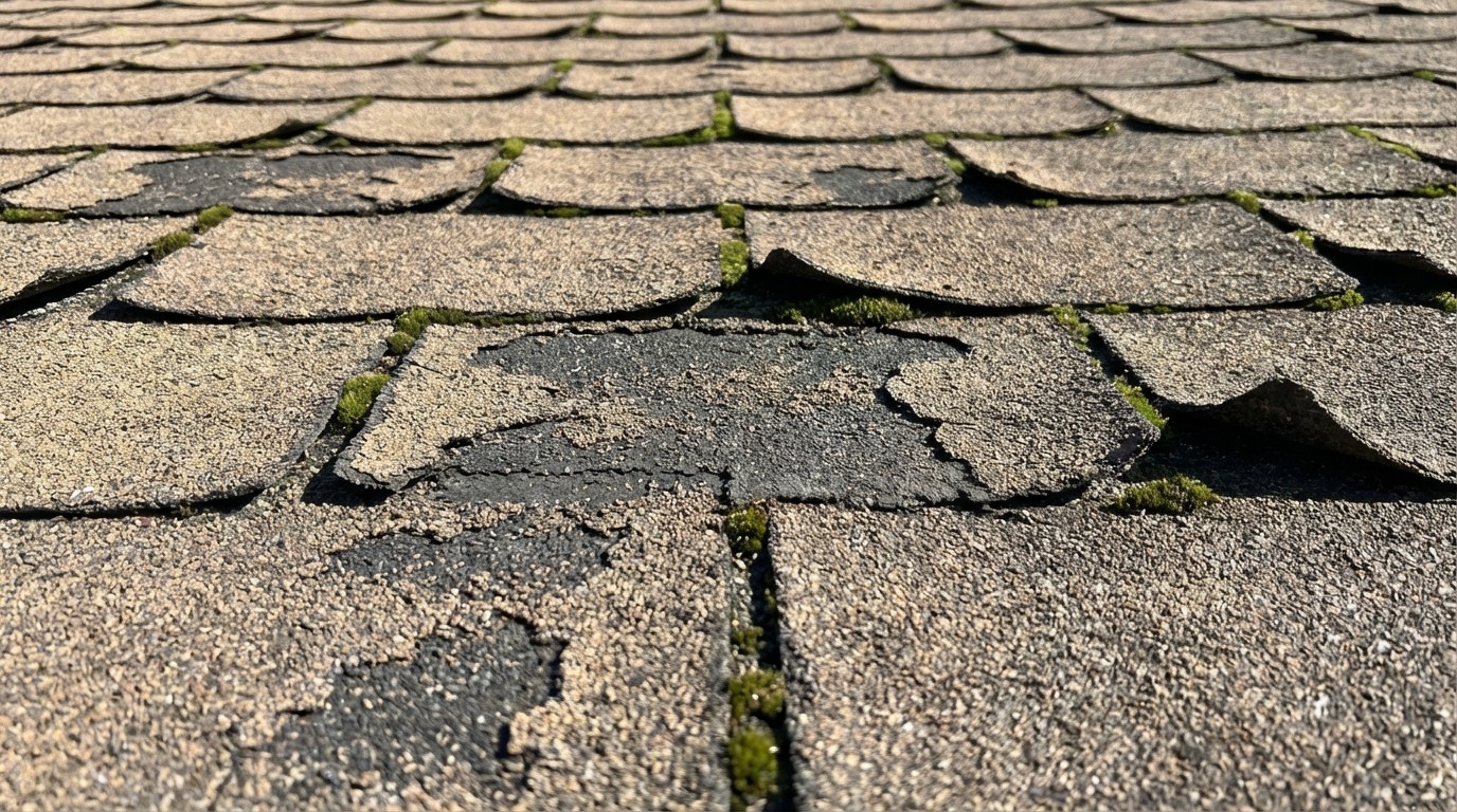 Age indicators: Granule loss, curling, and brittleness that suggest wear and tear