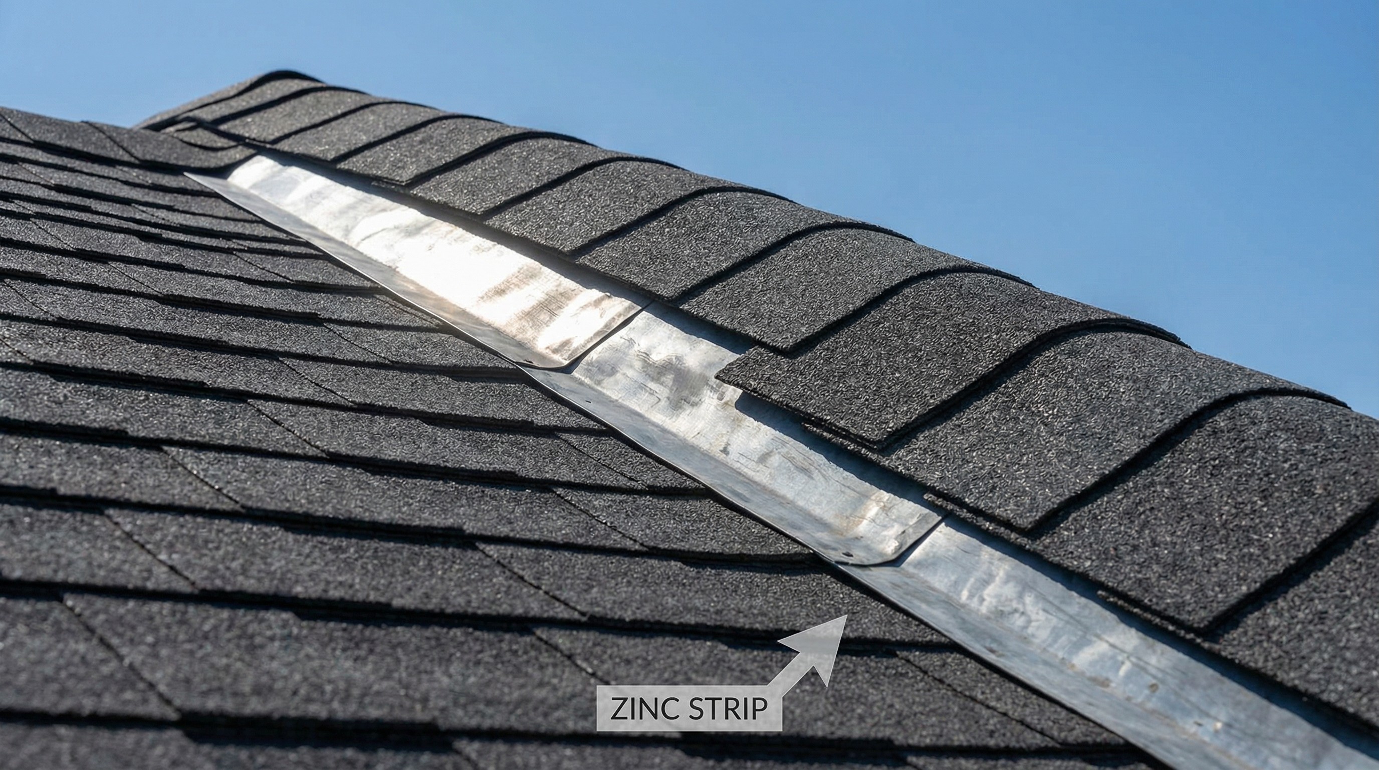 Metal strips installed along the roof ridge release particles when rain washes over them. Those particles run down the roof and create an environment where moss cannot take hold.