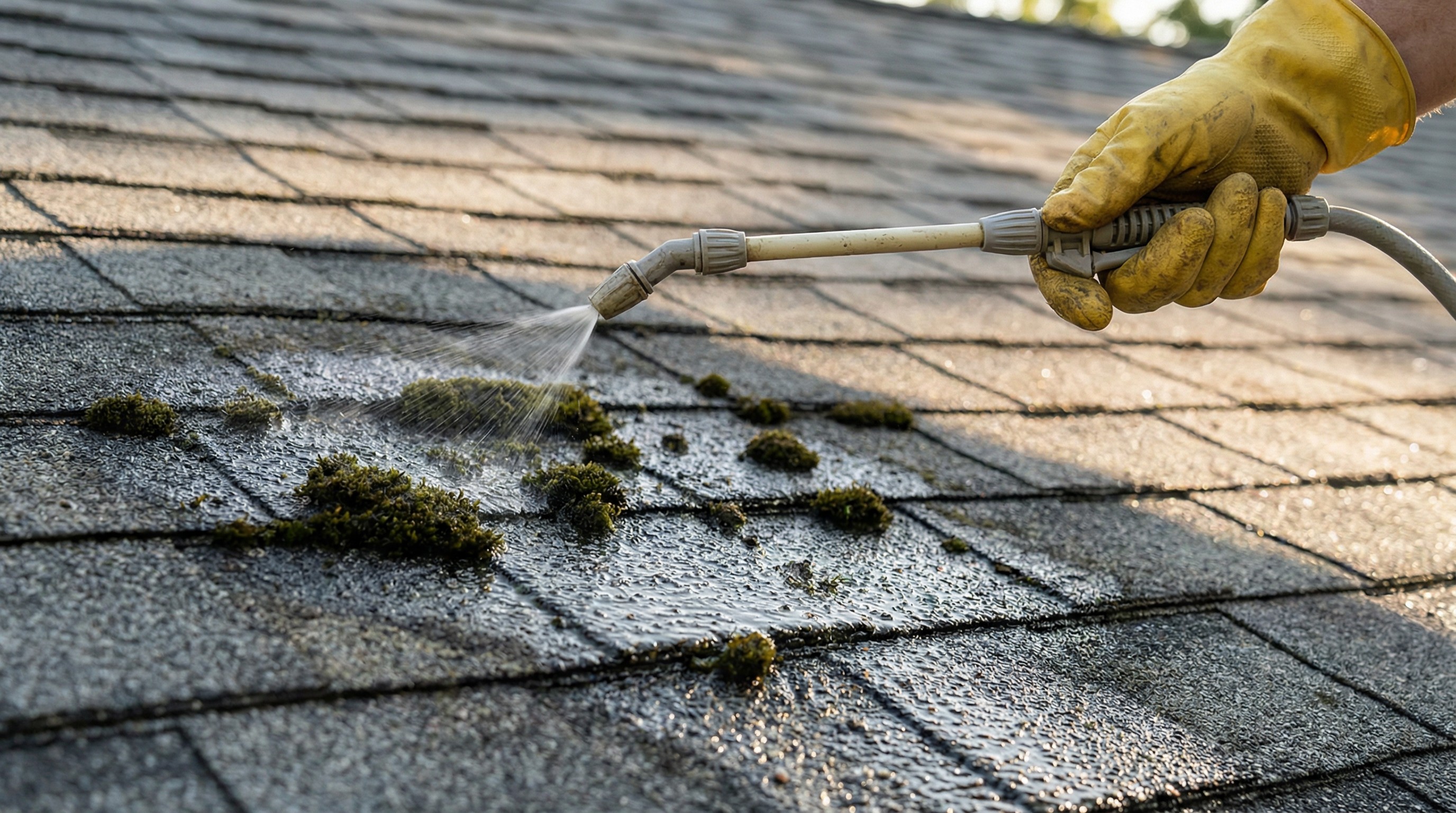 Professional roofers typically use a method called soft washing. This involves applying commercial-grade moss treatments at low pressure, which cleans the roof without stripping granules or forcing water under shingles.