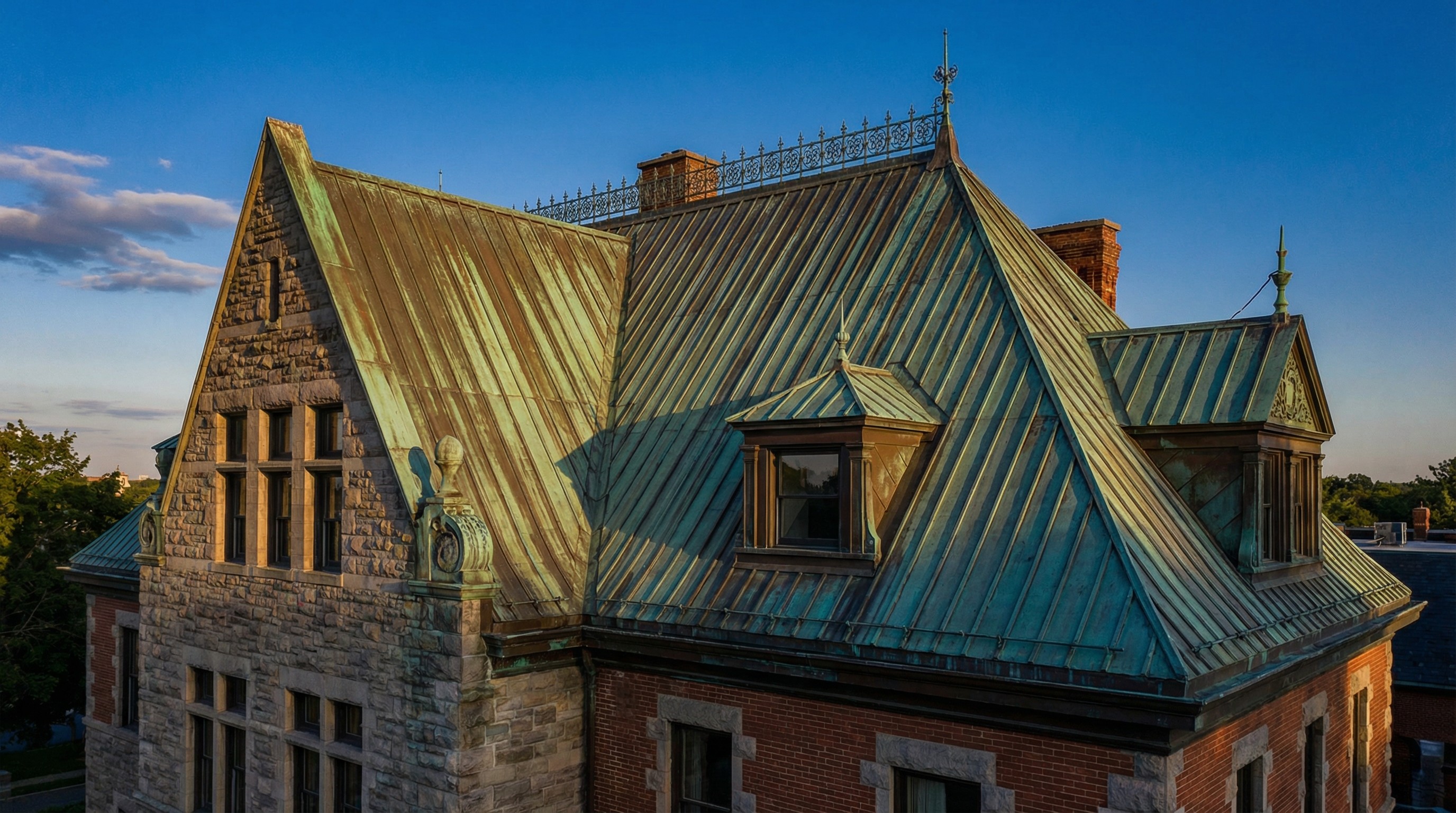 Copper is a premium roofing material with a price tag to match. You'll often see it on historic buildings, upscale custom homes, or as an accent on dormers and entryways rather than covering an entire roof. Over time, copper develops a green patina that gives it a distinctive aged appearance.