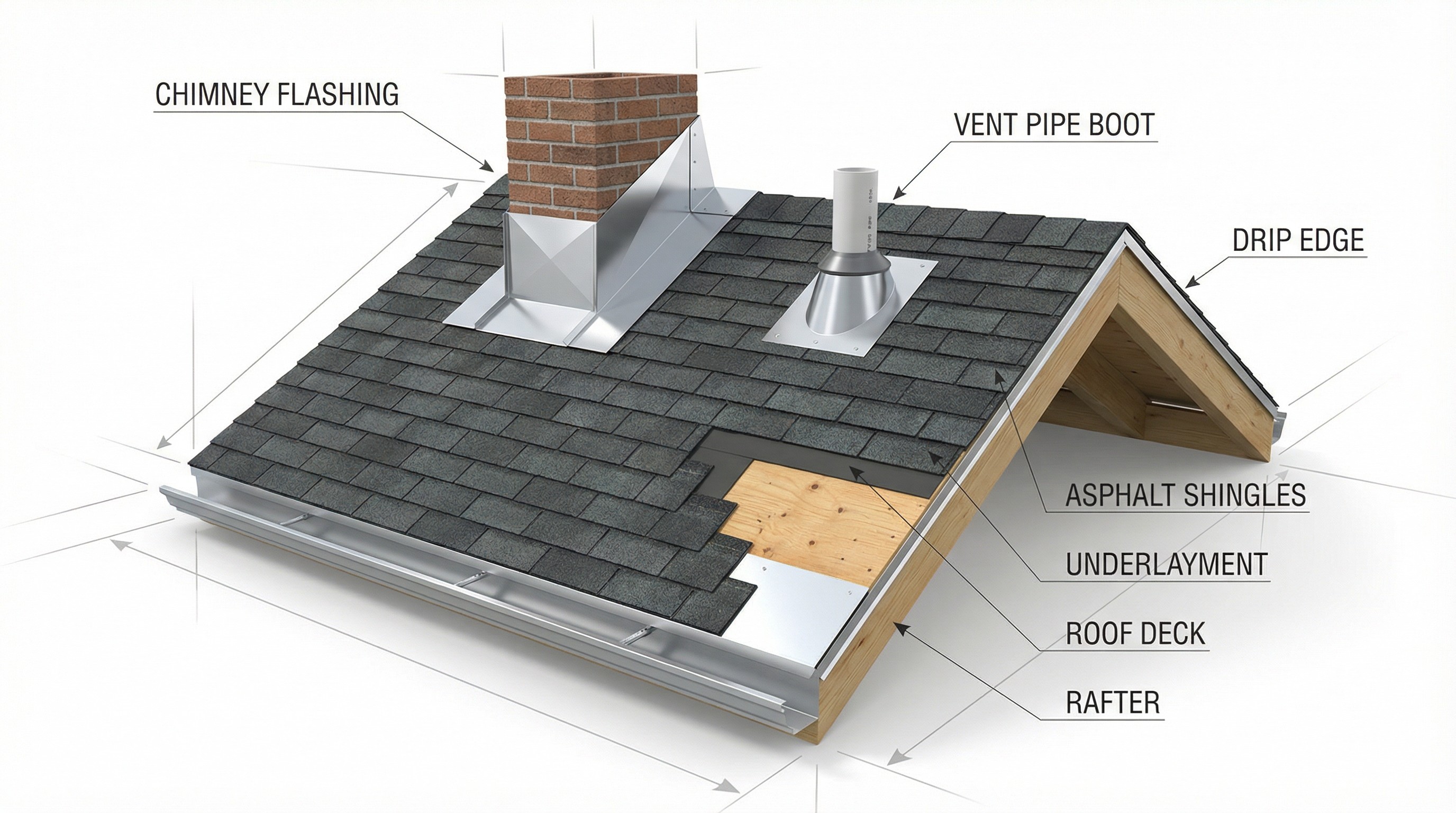 Roof flashing is thin metal sheeting installed at every joint, edge, and penetration on your roof to keep water from seeping into your home. It's the part of your roofing system that protects the vulnerable spots where shingles alone can't do the job.