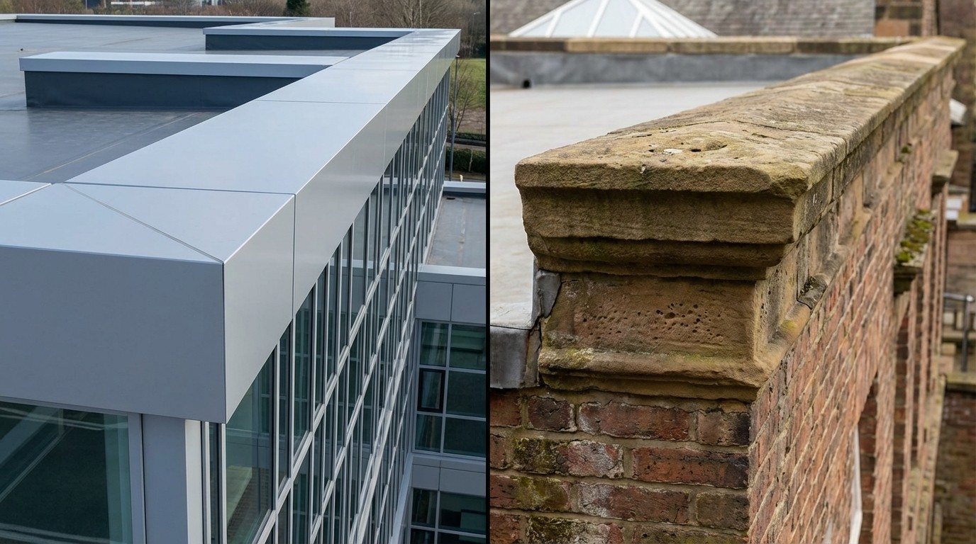 Stone and concrete coping give buildings a traditional, finished look and are incredibly durable when properly supported. The important consideration is weight: stone and concrete require strong structural support, and repairs can be more complex and expensive than with metal options.