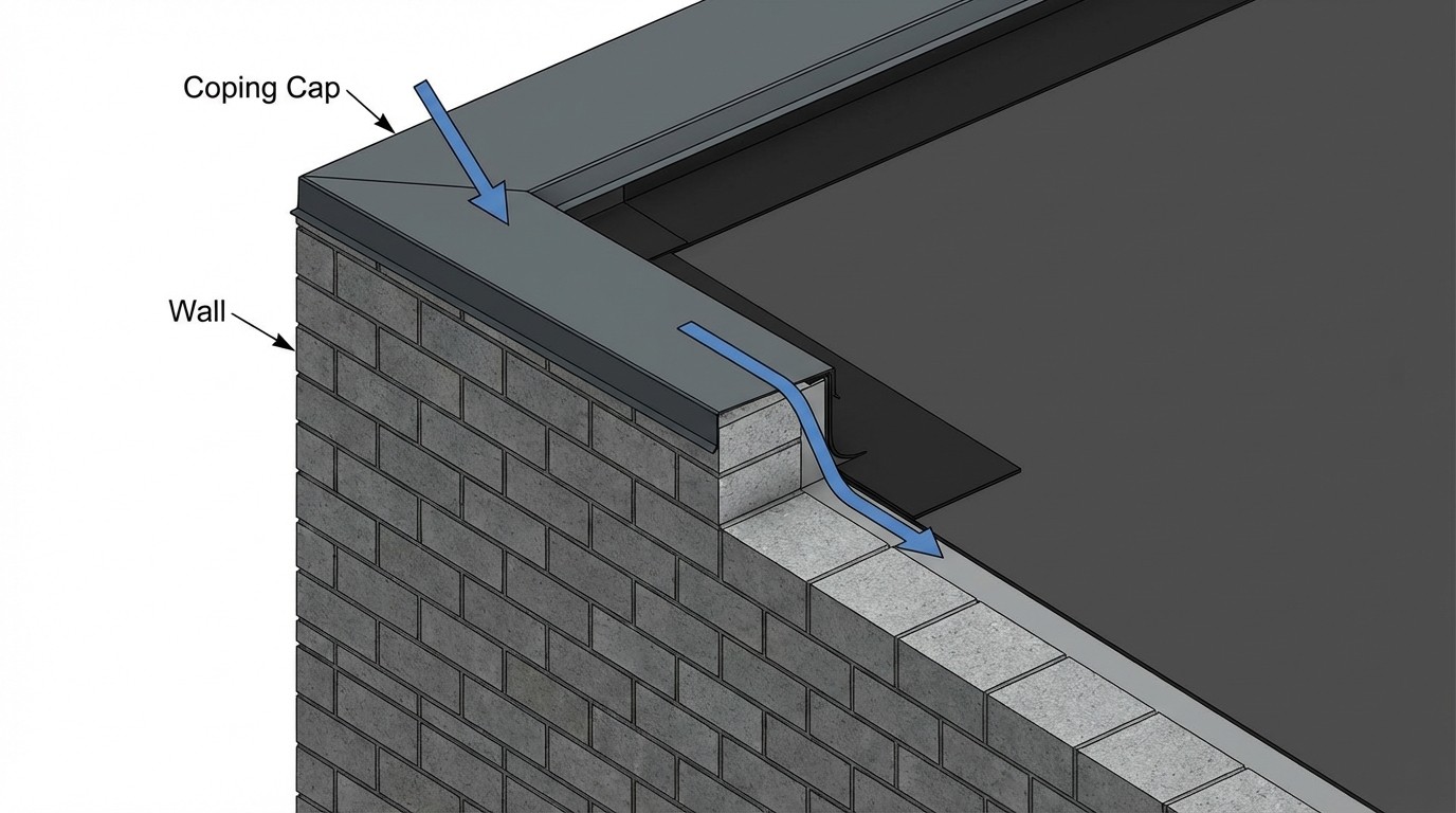 Parapet walls are the short walls that extend above the roofline on flat or low-slope roofs. Coping caps the top of parapet walls, creating a finished edge that keeps water from soaking into the masonry or membrane below. This is the most common application you'll see.