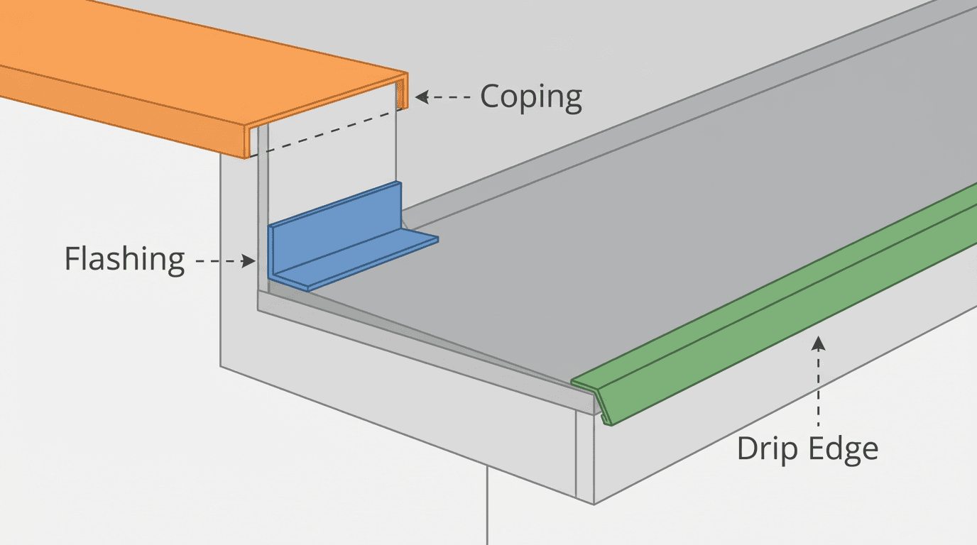 Drip edge: Installed along sloped roof edges to direct water into gutters; serves a different purpose than coping