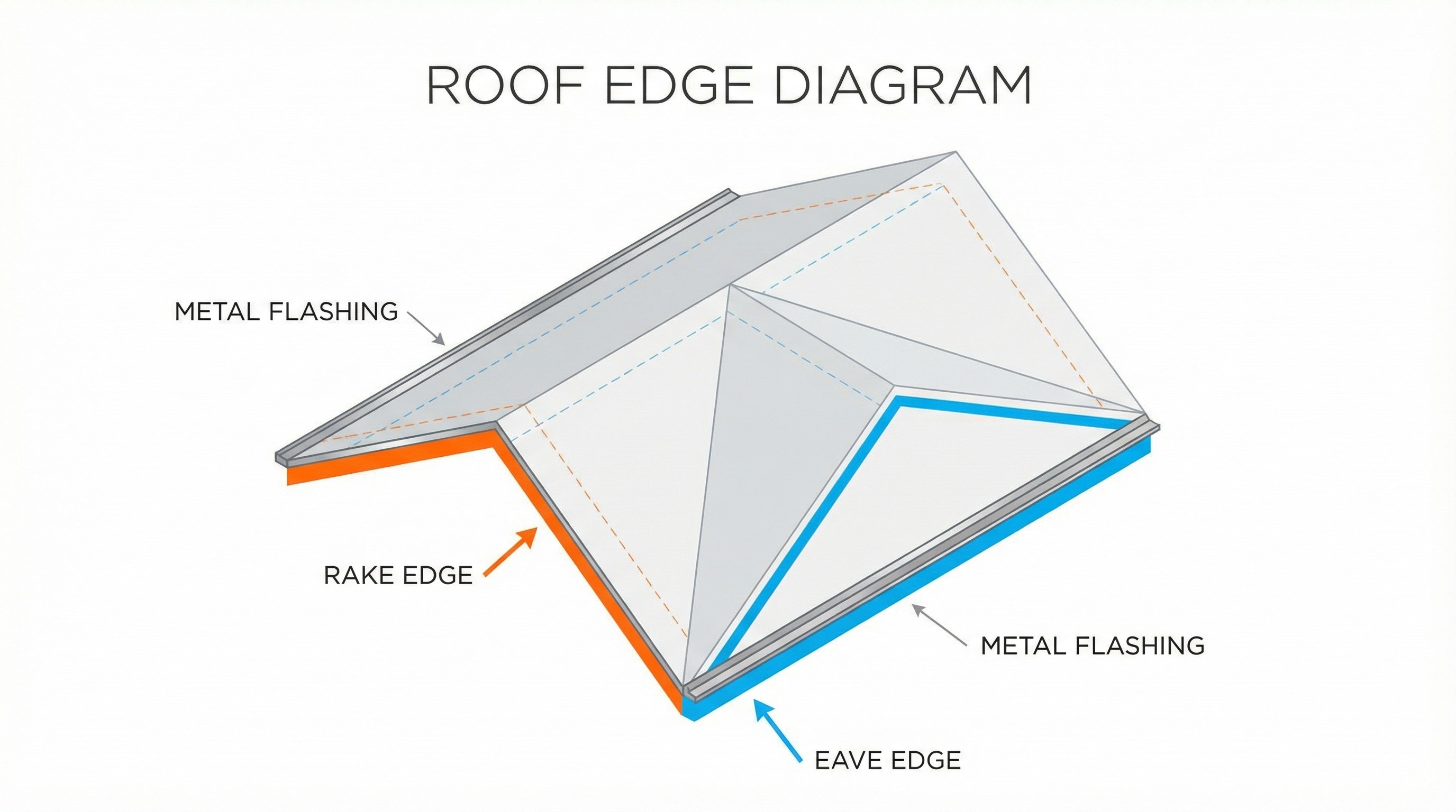 Your roof has drip edge in two locations. Eave drip edge runs along the bottom horizontal edge where your gutters hang. Rake drip edge runs along the sloped sides of your roof, which roofers sometimes call the gable ends. Both serve the same purpose, just in different spots.