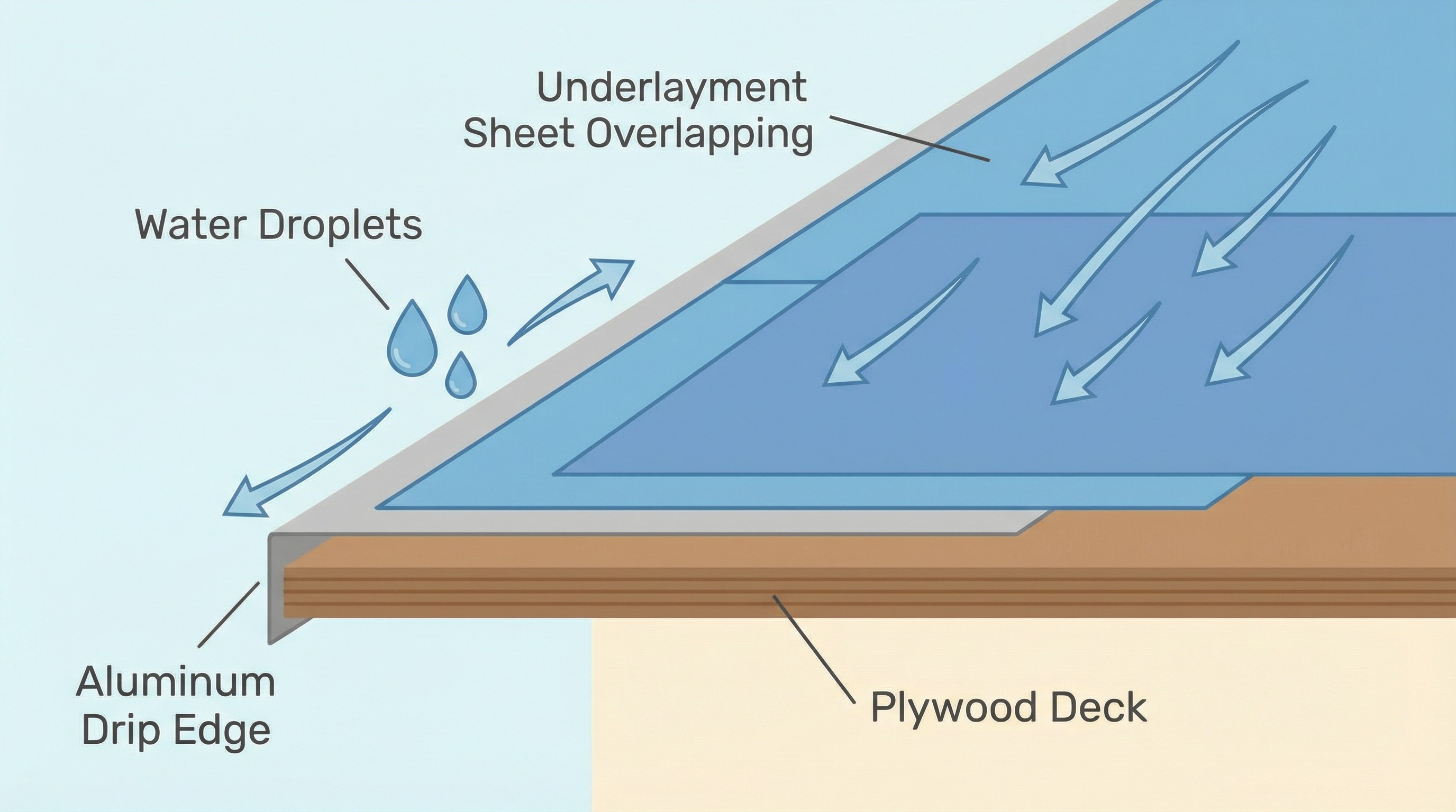 The underlayment, whether felt paper or synthetic, lays on top of the eave drip edge. This creates the correct water flow direction. Moisture always moves outward and down, never backward under the roofing materials.