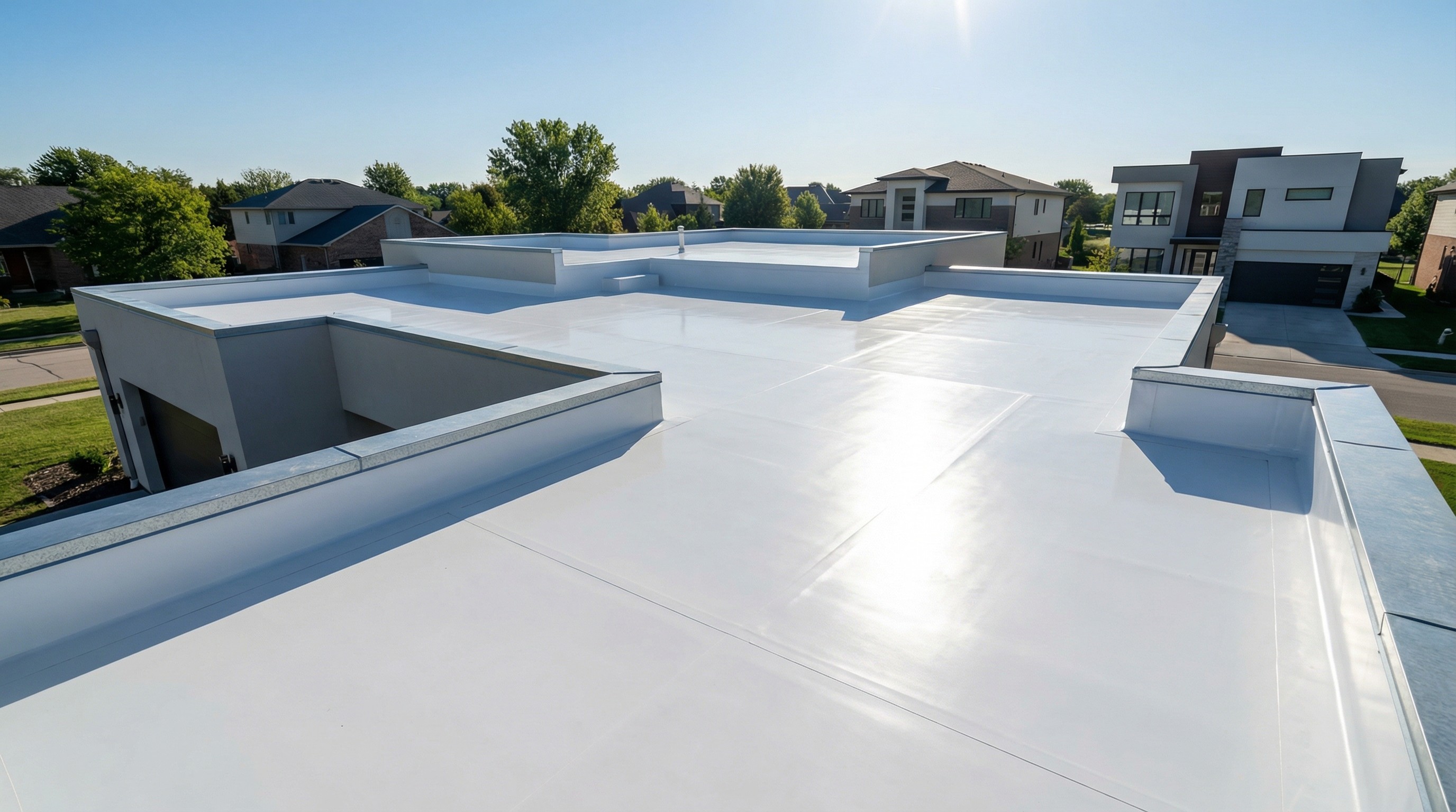 PVC works well for residential flat roofs, though it's less common than on commercial buildings. It's particularly suited for flat sections of homes, room additions, covered porches, and modern architectural designs.