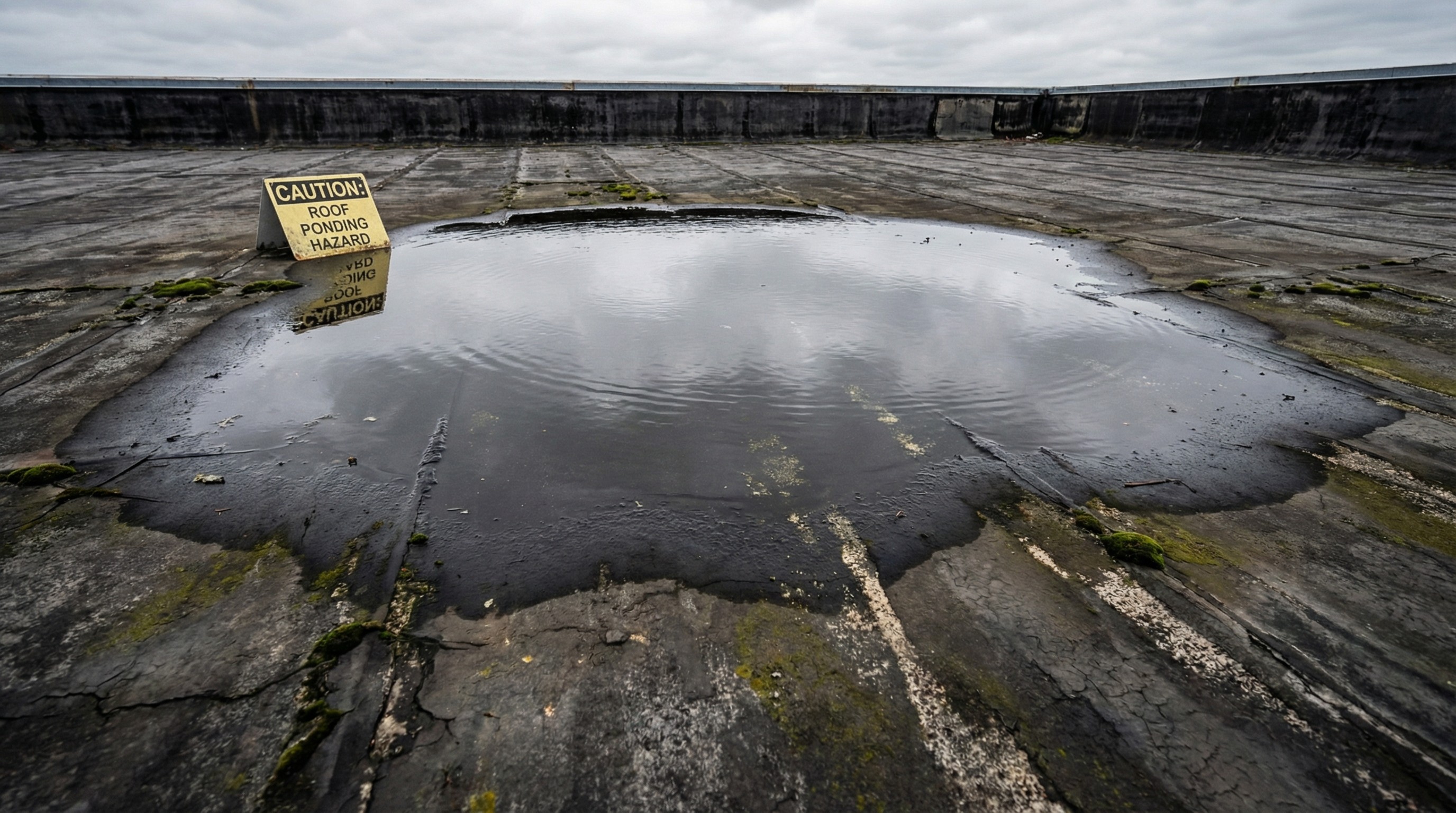 Ponding refers to water that sits on the roof for more than 48 hours after rain. Flat roofs aren't perfectly flat; they have a slight slope to direct water toward drains. If water pools and stays, it usually means the slope is off or drains are clogged. Ponding accelerates wear on any membrane.