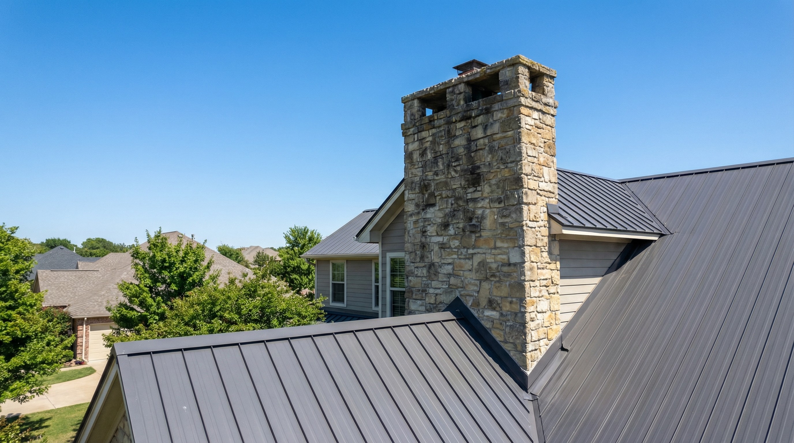 Chimneys are the most common location for a roof cricket. They are wide, they sit directly in the path of water flowing downhill, and they create a natural dam on the uphill side. A cricket behind the chimney forms a peak that directs water to either side, preventing it from pooling against the chimney base.