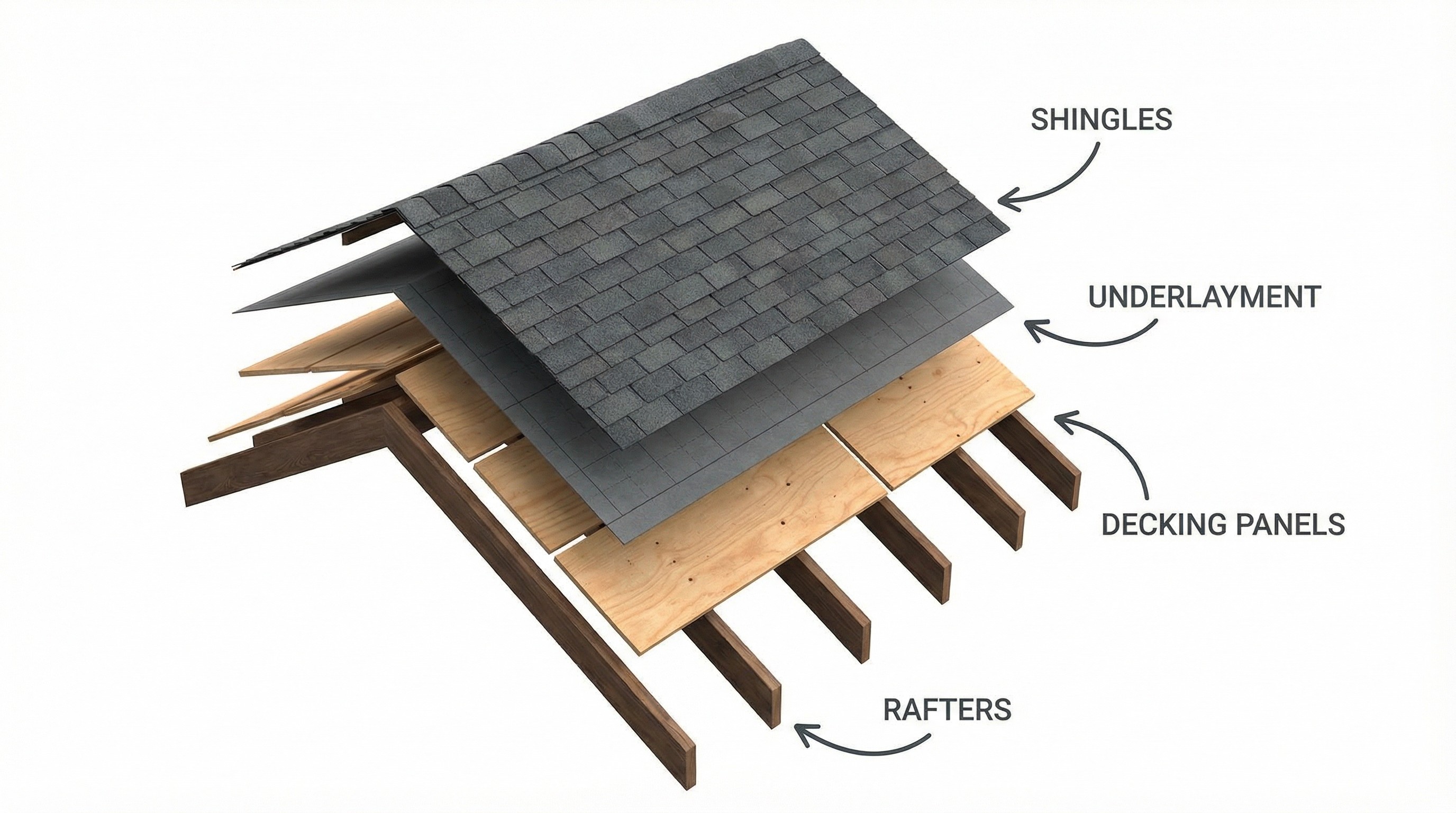 Think of your roof's structure in layers, with each component building on the next. At the bottom, you have rafters or trusses, which are the angled wooden beams that give your roof its shape. Flat panels of decking get nailed across those beams. Then underlayment (a water-resistant sheet) goes on top of the decking, and finally your shingles sit on the very outside.
